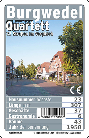 | Bergedorf-Quartett | 32 Straßen Hamburg-Bergedorfs im Vergleich. Gespielt wird mit den Kategorien "Höchste Hausnummer", "Länge der Straße", "Geschäfte", "Gastronomie", "Bäume" und "Jahr der Benennung". | 5,99 | ![]() |