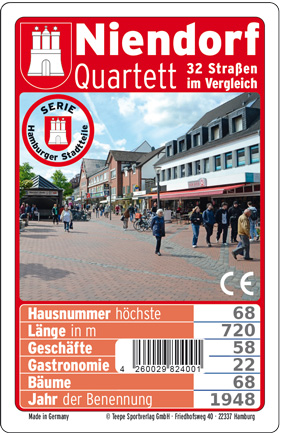 | Niendorf-Quartett | 32 Straßen Hamburg-Niendorfs im Vergleich. Gespielt wird mit den Kategorien "Höchste Hausnummer", "Länge der Straße", "Geschäfte", "Gastronomie", "Bäume" und "Jahr der Benennung". | 5,99 | ![]() |