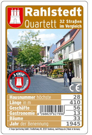 | Rahlstedt-Quartett | 32 Straßen Hamburg-Rahlstedts im Vergleich. Gespielt wird mit den Kategorien "Höchste Hausnummer", "Länge der Straße", "Geschäfte", "Gastronomie", "Bäume" und "Jahr der Benennung". | 5,99 | ![]() |