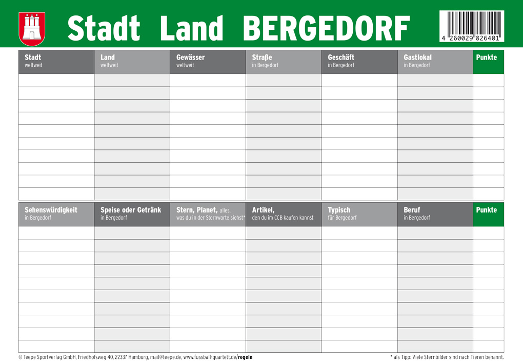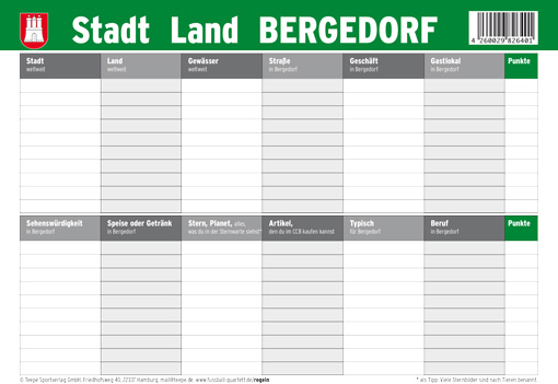 | Stadt Land Bergedorf | Stadt Land Bergedorf – ein Block mit 50 Seiten. Wer zuerst die Felder aller Kategorien ausgefüllt hat, ruft „fertig“. | € 5,00 | ![]() |