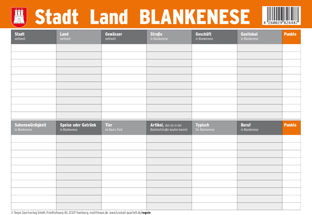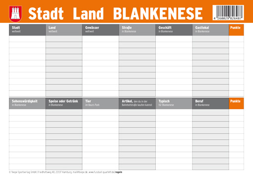 | Stadt Land Blankenese | Stadt Land Blankenese – ein Block mit 50 Seiten. Wer zuerst die Felder aller Kategorien ausgefüllt hat, ruft „fertig“. | € 5,00 | ![]() |
