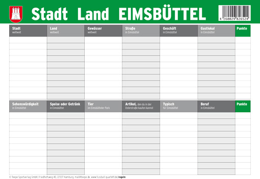 | Stadt Land Eimsbüttel | Stadt Land Eimsbüttel – ein Block mit 50 Seiten. Wer zuerst die Felder aller Kategorien ausgefüllt hat, ruft „fertig“. | € 5,00 | ![]() |