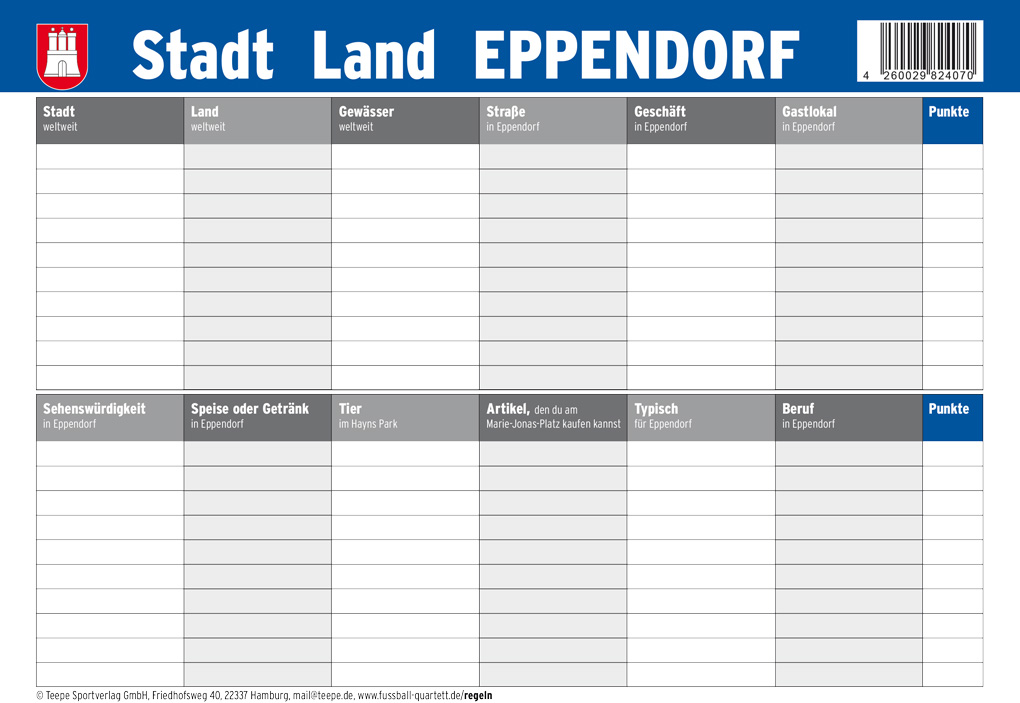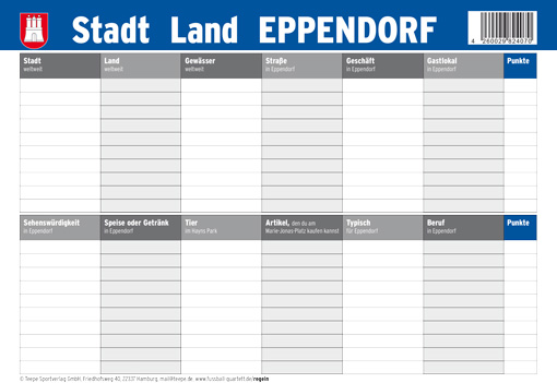 | Stadt Land Eppendorf | Stadt Land Eppendorf – ein Block mit 50 Seiten. Wer zuerst die Felder aller Kategorien ausgefüllt hat, ruft „fertig“. | € 5,00 | ![]() |