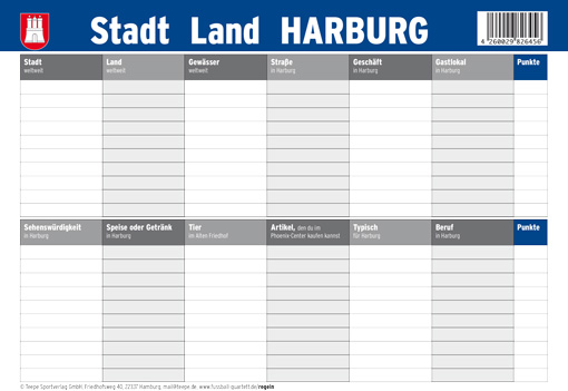 | Stadt Land Harburg | Stadt Land Harburg – ein Block mit 50 Seiten. Wer zuerst die Felder aller Kategorien ausgefüllt hat, ruft „fertig“. | € 5,00 | ![]() |