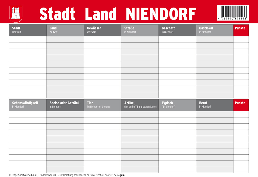 | Stadt Land Niendorf | Stadt Land Niendorf – ein Block mit 50 Seiten. Wer zuerst die Felder aller Kategorien ausgefüllt hat, ruft „fertig“. | € 5,00 | ![]() |