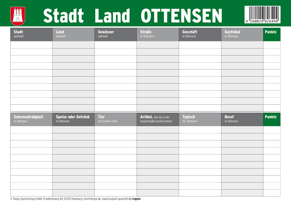 | Stadt Land Ottensen | Stadt Land Ottensen – ein Block mit 50 Seiten. Wer zuerst die Felder aller Kategorien ausgefüllt hat, ruft „fertig“. | € 5,00 | ![]() |