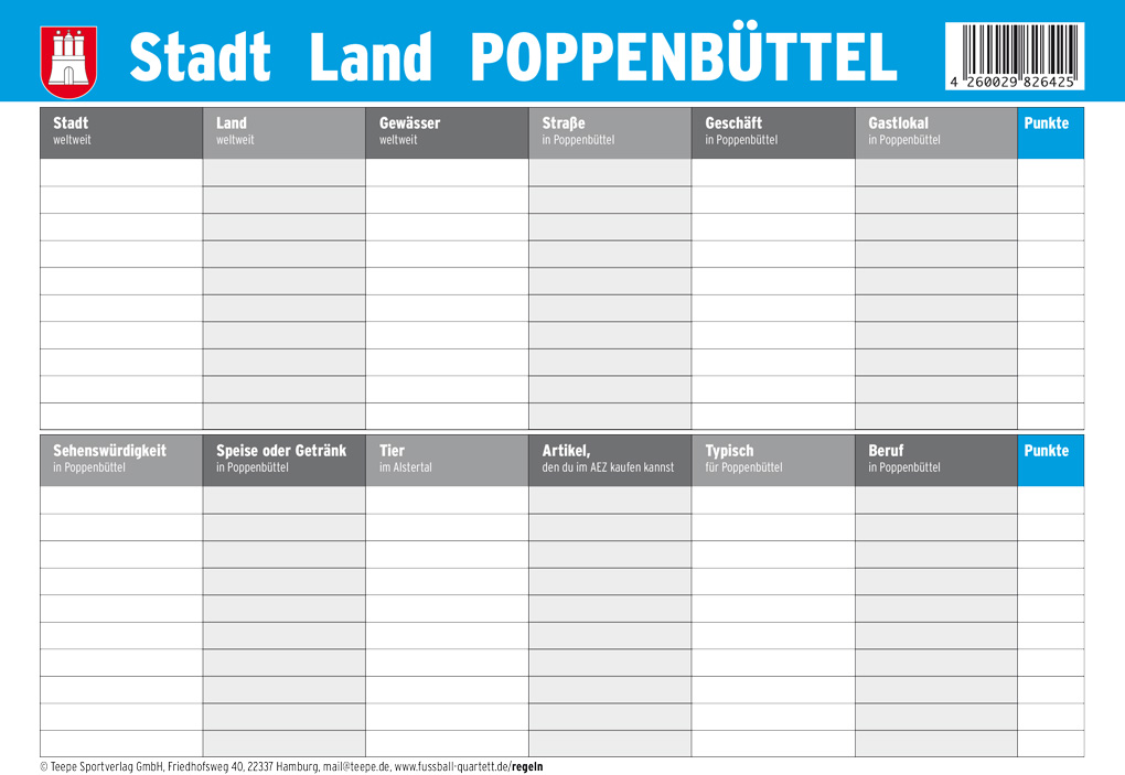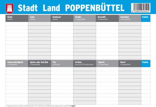 | Stadt Land Poppenbüttel | Stadt Land Poppenbüttel – ein Block mit 50 Seiten. Wer zuerst die Felder aller Kategorien ausgefüllt hat, ruft „fertig“. | € 5,00 | ![]() |