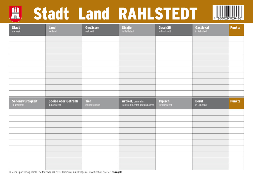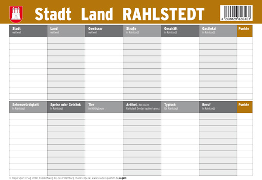 | Stadt Land Rahlstedt | Stadt Land Rahlstedt – ein Block mit 50 Seiten. Wer zuerst die Felder aller Kategorien ausgefüllt hat, ruft „fertig“. | € 5,00 | ![]() |
