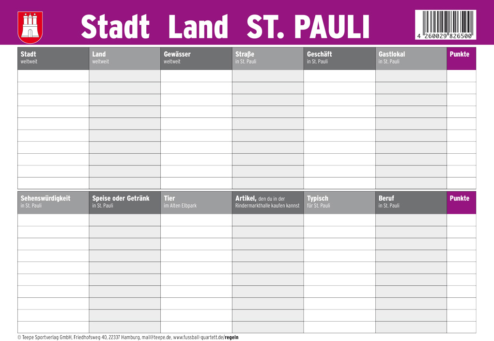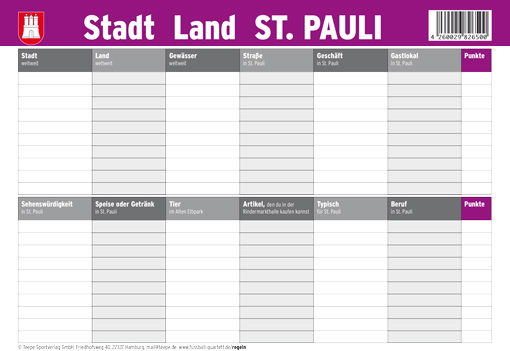| Stadt Land St. Pauli | Stadt Land St. Pauli – ein Block mit 50 Seiten. Wer zuerst die Felder aller Kategorien ausgefüllt hat, ruft „fertig“. | € 5,00 | ![]() |