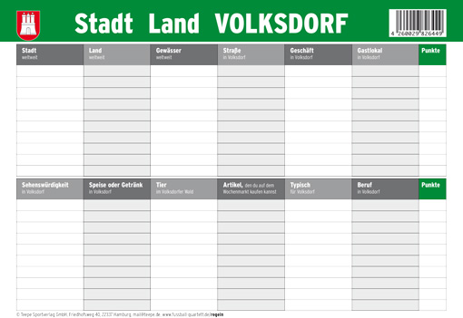 | Stadt Land Volksdorf | Stadt Land Volksdorf – ein Block mit 50 Seiten. Wer zuerst die Felder aller Kategorien ausgefüllt hat, ruft „fertig“. | € 5,00 | ![]() |