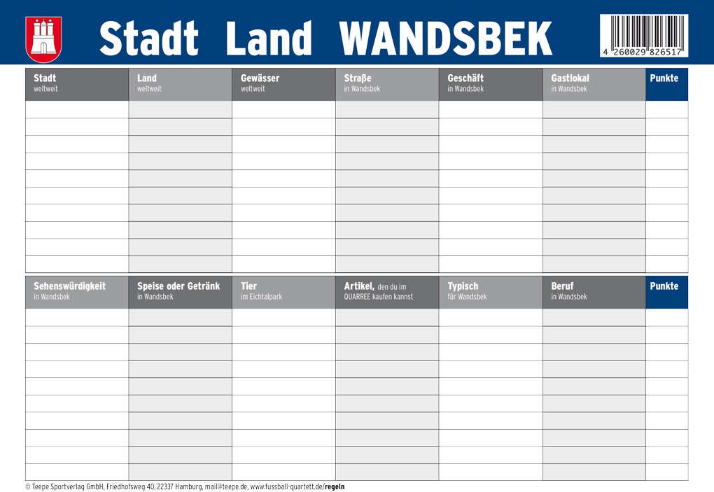 | Stadt Land Wandsbek | Stadt Land Wandsbek – ein Block mit 50 Seiten. Wer zuerst die Felder aller Kategorien ausgefüllt hat, ruft „fertig“. | € 5,00 | ![]() |