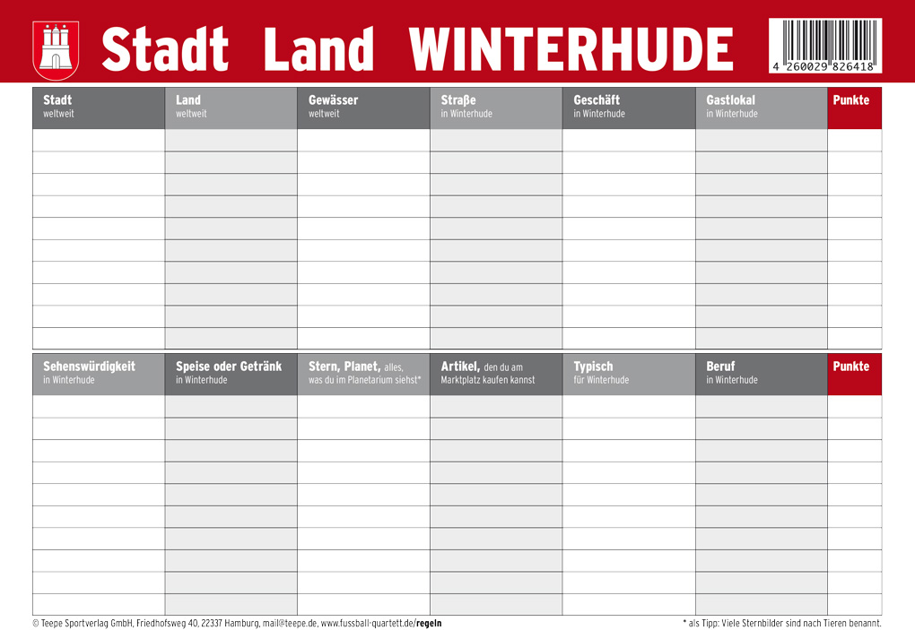 | Stadt Land Winterhude | Stadt Land Winterhude – ein Block mit 50 Seiten. Wer zuerst die Felder aller Kategorien ausgefüllt hat, ruft „fertig“. | € 5,00 | ![]() |