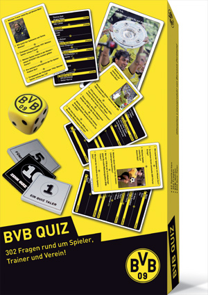 Endlich gibt es ein abendfüllendes BVB-Quiz! Die Kombination aus Karten- und Würfelspiel enthält 302 Fragen in sechs Schwierigkeits-Stufen. Würfel ich eine "Eins", muss ich die leichte Frage "1" beantworten, bekomme aber auch nur einen Taler. Würfel ich eine "Sechs", ist die Frage "6" zwar schwer, die richtige Antwort wird aber mit sechs Talern belohnt. 62 Spielkarten mit 302 Fragen, 1.208 mögliche Antworten, 1 BVB-Würfel, 800 Quiz-Taler, Karten-Aufsteller. Preis € 9,99.