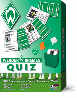 | Werder Bremen-Quiz Endlich gibt es ein abendfüllendes Bayern-Quiz! Die Kombination aus Karten- und Würfelspiel enthält 302 Fragen in sechs Schwierigkeits-Stufen. Würfel ich eine "Eins", muss ich die leichte Frage "1" beantworten, bekomme aber auch nur einen Taler. Würfel ich eine "Sechs", ist die Frage "6" zwar schwer, die richtige Antwort wird aber mit sechs Talern belohnt. 48 Spielkarten mit 302 Fragen, 1.208 mögliche Antworten, 1 Werder-Würfel, 800 Quiz-Taler.