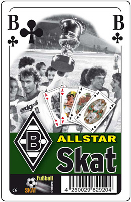 | Allstar-Skat Spiele Skat mit Bildern Deines Clubs von vorgestern, gestern und heute. Beim Fußball-Skat kann der Fußballfreund mit Motiven seines Lieblingsvereins reizen. Jedem Kartenwert ist ein Spieler zugeordnet, die Rückseiten sind wiederum mit dem Vereinslogo bedruckt. Ideal für gesellige Stunden außerhalb des Stadions. |