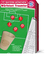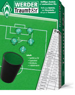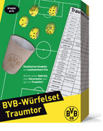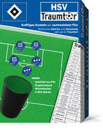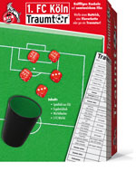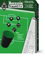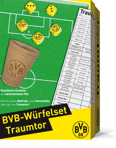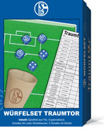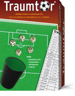 Ein von innen mit Filz bezogener Deckel mit aufgedrucktem Fußball-Feld als Würfelteller, ein Würfelbecher, 5 und ein Ergebnis-Block des Spiels "Traumtor" bilden dieses schöne Würfelspiel. Für 2-6 Spieler ab 6 Jahren Ergebnisblatt zum Ansehen und Ausdrucken. |
