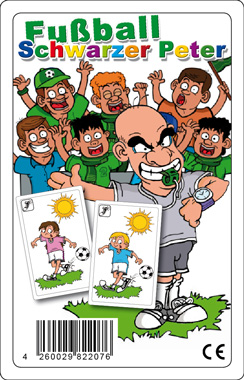 Ein kleiner Junge und ein kleines Mädchen spielen typische Fußball-Szenen durch. Niedliche Zeichnungen und ein entschlossener Schiedsrichter als Schwarzer Peter bilden dieses Kartenspiel. Ab 4 Jahren. |