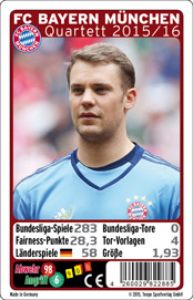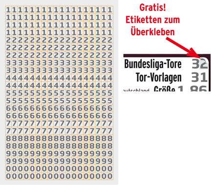 Nach jedem Bundesliga-Spieltag oder Länderspiel können nun die Karten mit den beiliegenden Etiketten korrigiert werden. Um die aktuellen Zahlen zu erfahren, klicke ganz oben auf das Bayern-Logo. Danach kannst mit mittels Klick auf die Spieler erfahren, wie der aktuelle Stand ist. |