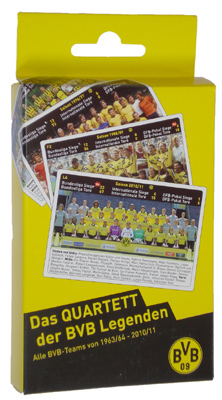 Fußball Legenden-Quartett Borussia Dortmund Das Kartenspiel mit den Mannschaftsfotos der BVB-Geschichte. 48 große Spielkarten mit vielen Zahlen und Fakten über die alte und junge Borussia Dortmund-Vergangenheit. Gespielt wird nach "Fußball-Regeln" (z. B. "Wie viele Europapokal-Spiele gewann BVB in der Saison 1979/80"). Für 2-6 Spieler ab 6 Jahren; € 6,99 |