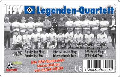 Fußball Legenden-Quartett HSV Ein Quartett mit 46 Fotos aller HSV-Mannschaften seit Bundesliga-Beginn von 1962/63-2008/09. Gespielt wird mit den Kategorien „Bundesliga-Siege“, „Bundesliga-Tore“, „Internationale Siege“, „Internationale Tore“, „DFB-Pokal Siege“ und „DFB-Pokal Tore“. 46 Spielkarten; ab 8 Jahre. Preis € 6,99. |