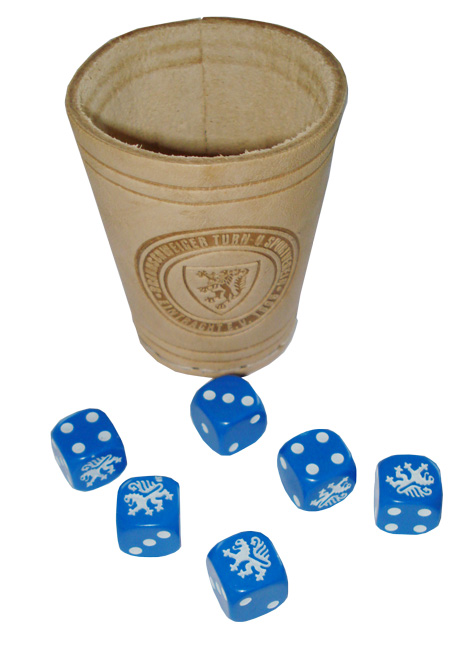 | Fußball-Würfelbecher Ob Kniffel, Backgammon, Würfelpoker oder Paschen - mit Fußball-Würfelbechern des Lieblingsvereins wird jede gesellige Spielstunde noch spaßiger. Jeder Würfelbecher ist mit dem Vereinslogo geprägt, auf den Würfeln steht statt der Sechs das jeweilige Vereinswappen, die Würfel selbst leuchten in den Vereinsfarben. |