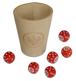 | Fußball-Würfelbecher Ob Kniffel, Backgammon, Würfelpoker oder Paschen - mit Fußball-Würfelbechern des Lieblingsvereins wird jede gesellige Spielstunde noch spaßiger. Jeder Würfelbecher ist mit dem Vereinslogo geprägt, auf den Würfeln steht statt der Sechs das jeweilige Vereinswappen, die Würfel selbst leuchten in den Vereinsfarben. |