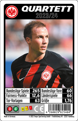 | Eintracht Frankfurt Quartett 23/24 | Das Eintracht Frankfurt-Quartett 2023/24! Dieses Kartenspiel kann nach drei verschiedenen Regeln gespielt werden: Fußball-Regeln, Klassisches Quartett und Abwehr-Angriff-Regeln. 32 Karten mit vielen Zahlen und Fakten über die aktuellen und acht ehemaligen Eintracht-Stars. | € 5,99 | ![]() |