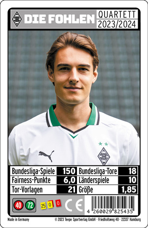 | Borussia Mönchengladbach Quartett 23/24 | Das Borussia Mönchengladbach-Quartett 2023/24! Dieses Kartenspiel kann nach drei verschiedenen Regeln gespielt werden: Fußball-Regeln, Klassisches Quartett und Abwehr-Angriff-Regeln. 32 Karten mit vielen Zahlen und Fakten über die aktuellen und acht ehemaligen Borussia-Stars. | € 5,99 | ![]() |