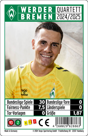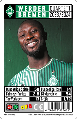 | Werder Bremen Quartett 23/24 | Das Werder Bremen-Quartett 2023/24! Dieses Kartenspiel kann nach drei verschiedenen Regeln gespielt werden: Fußball-Regeln, Klassisches Quartett und Abwehr-Angriff-Regeln. 32 Karten mit vielen Zahlen und Fakten über die aktuellen und acht ehemaligen Werder-Stars. | € 5,99 | ![]() |