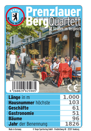 Prenzlauer Berg-Quartett Dieses Kartenspiel mit 32 Straßen kann nach zwei verschiedenen Regeln gespielt werden: Bei den Berlin-Regeln wählt ein Spieler eine Kategorie, z. B. Wie viele Geschäfte hat die Kastanienallee?. Derjenige, dessen Karte die höchste Zahl aufweist, gewinnt die Karte der Mitspieler. Oder es wird nach den klassischen Quartettregeln gespielt. 32 Karten mit vielen schönen Bildern, Zahlen und Fakten. Für 2-6 Spieler ab 6 Jahren |