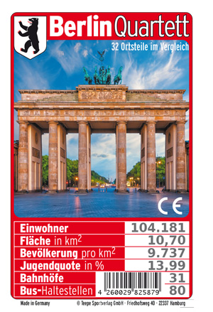 Berlin Quartett € 5,99 | Das Berlin-Quartett Dieses Kartenspiel mit 32 Ortsteilen kann nach zwei verschiedenen Regeln gespielt werden: Bei den Berlin-Regeln wählt ein Spieler eine Kategorie, z. B. Wie viele Bahnhöfe hat Kreuzberg?. Derjenige, dessen Karte die höchste Zahl aufweist, gewinnt die Karte der Mitspieler. Oder es wird nach den klassischen Quartettregeln gespielt. 32 Karten mit vielen schönen Bildern, Zahlen und Fakten. Für 2-6 Spieler ab 6 Jahren |