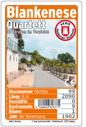 | Blankenese-Quartett | 32 Straßen Hamburg-Blankeneses im Vergleich. Gespielt wird mit den Kategorien "Höchste Hausnummer", "Länge der Straße", "Geschäfte", "Gastronomie", "Bäume" und "Jahr der Benennung". | 5,99 | ![]() |