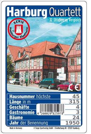 | Harburg-Quartett | 32 Straßen Hamburg-Harburgs im Vergleich. Gespielt wird mit den Kategorien "Höchste Hausnummer", "Länge der Straße", "Geschäfte", "Gastronomie", "Bäume" und "Jahr der Benennung". | 5,99 | ![]() |