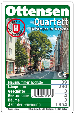 | St. Ottensen-Quartett | 32 Straßen Hamburg-Ottensens im Vergleich. Gespielt wird mit den Kategorien "Höchste Hausnummer", "Länge der Straße", "Geschäfte", "Gastronomie", "Bäume" und "Jahr der Benennung". | 5,99 | ![]() |
